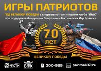 26 Апреля 2015 года состоится первое мероприятие, посвященное 9 мая из серии "ИГРЫ ПАТРИОТОВ". В честь 70-летия Великой Победы Советского Союза в Великой Отечественной Войне Международная Общественная Организация содействия развитию физической культуры и спорта "Федерация Спортивно-Тактических Игр"Брянский филиал совместно со спортивно-тактическим клубом "БЫК" открывает серию игр "ИГРЫ ПАТРИОТОВ" в Год великой победы. Подробнее
