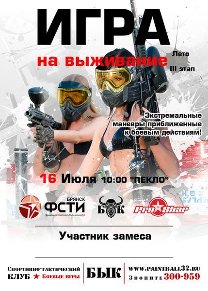 Настало время для третьего этапа "Игры на Выживание" летней серии 2014 г. под кодовым названием "ПЕКЛО". Дата: 16 августа 2014 г. Время: сборы с 10-00 до 10-30, начало состязаний 10-30 Место: пейнтбольный парк (Первый Брянск, ул. Лесная) Температура: 30+ Узнать подробную информацию и зарегистрировать свою команду можно: На сайте: http://paintball32.ru/igra-na-vyzhivanie/ В группе: https://vk.com/topic-64224840_29318573 И по номерам телефонов: (4832) 300-959 89308200959